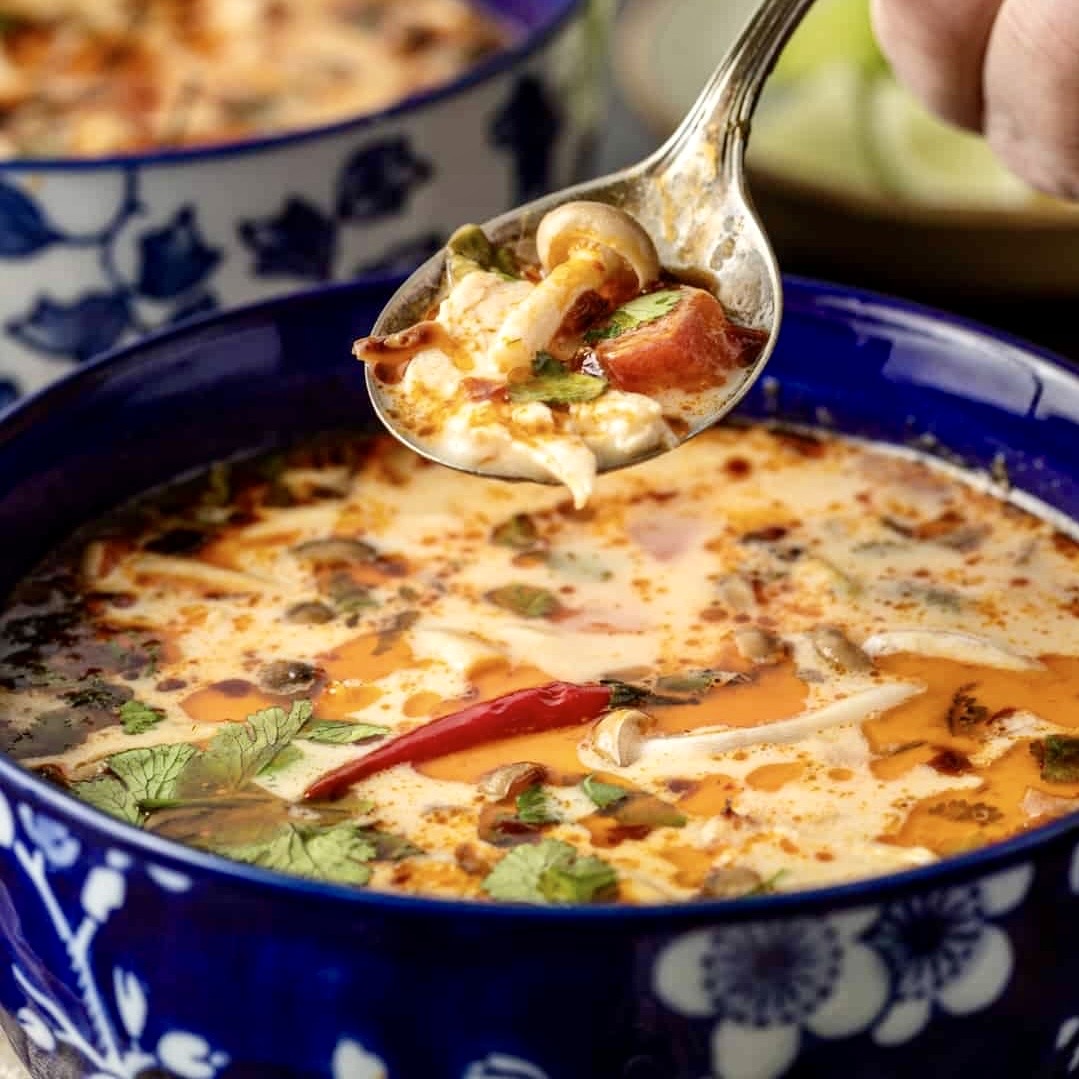 Krémes, kókusztejes thai leves citromnáddal, galangával, chilivel és lime levéllel. Illatos, enyhén csípős - igazi thai klasszikus. Kérheted csirkével vagy rákkal. Közepesen csípős!